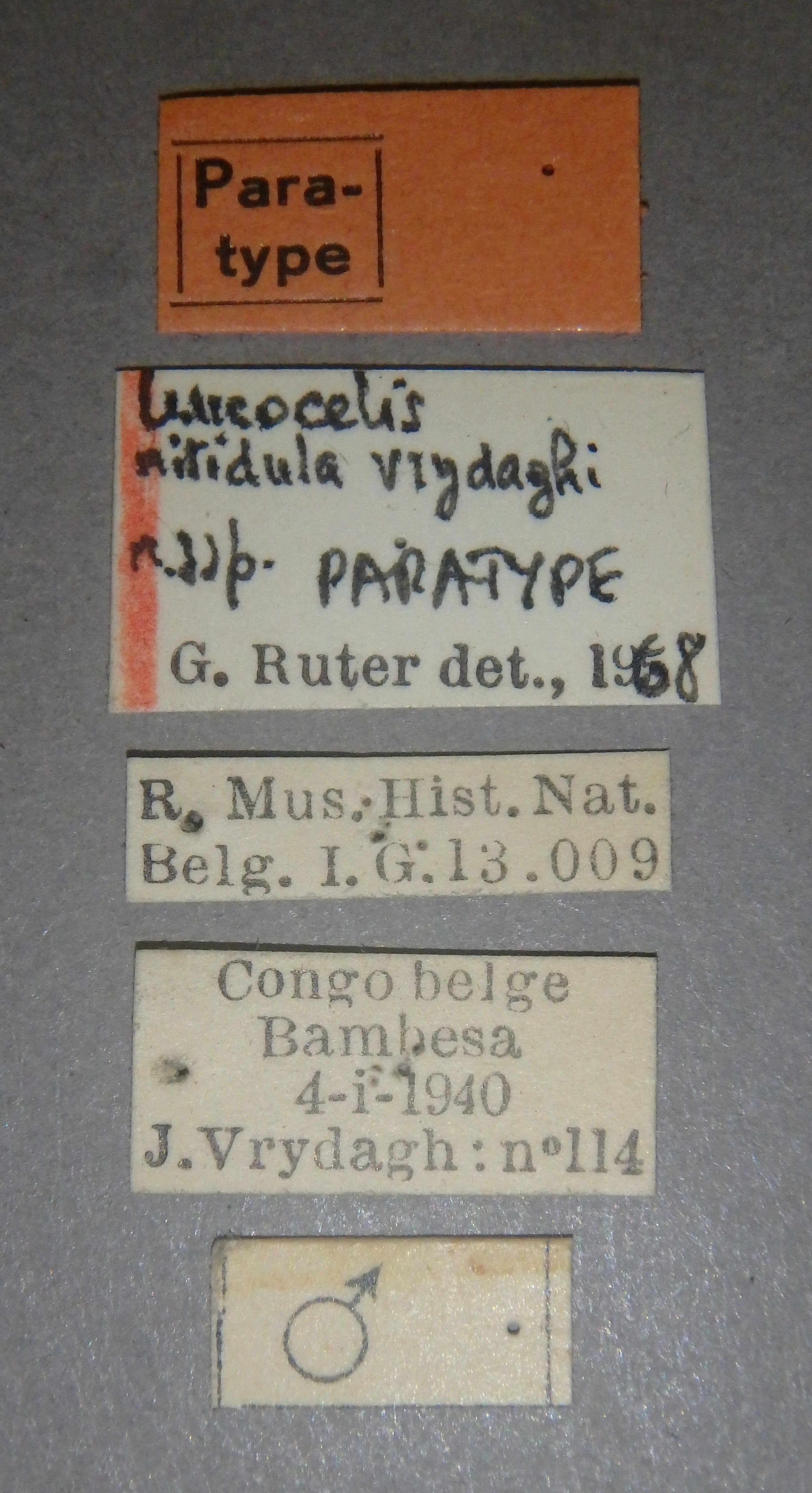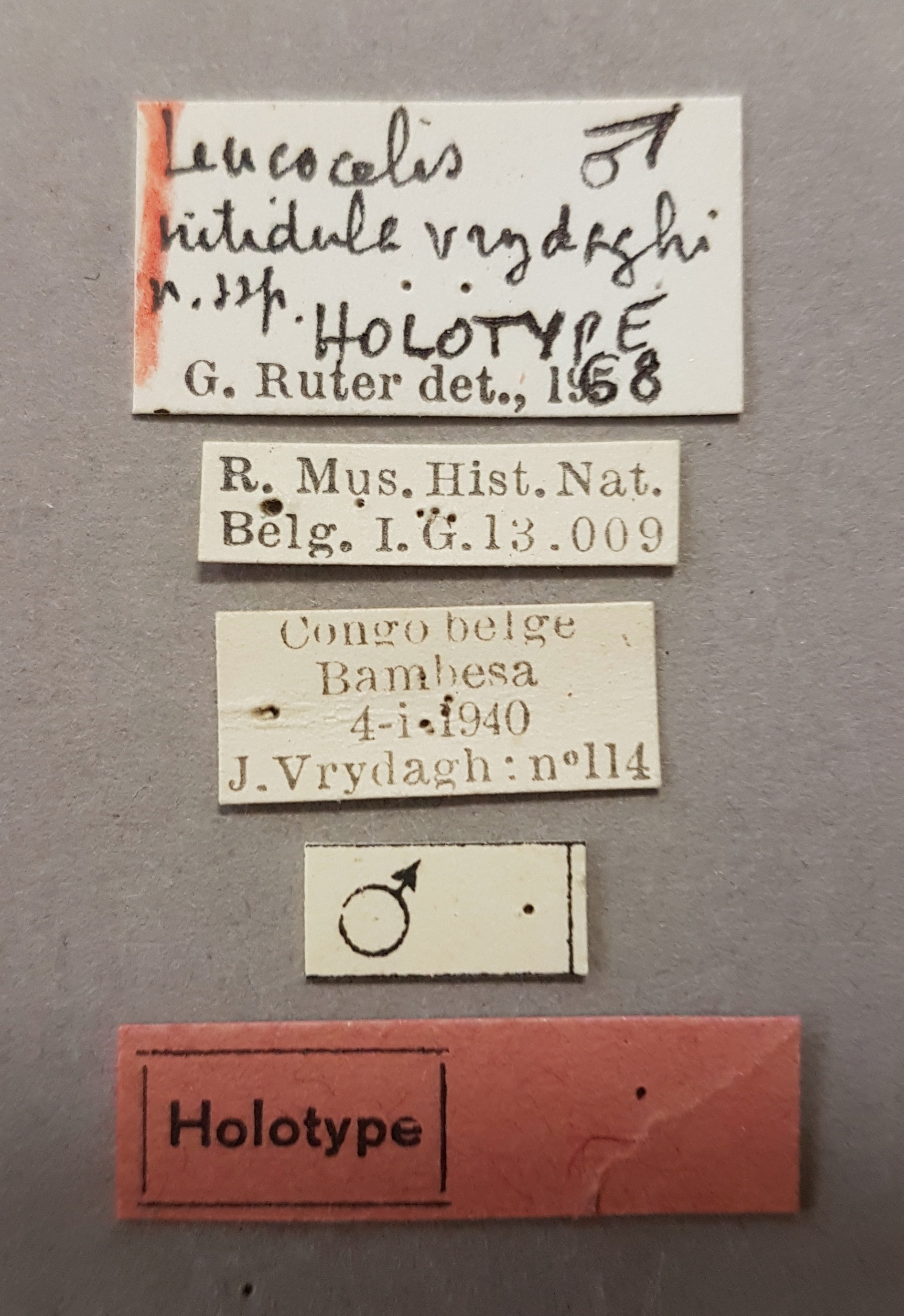 | Leucocelis nitidula vrydaghi Ruter, 1969 | Holotype | M | IRSNB | Royal Belgian Institute of Natural Sciences | RDC | Bas Uélé | Bambesa | 4-I-1940 | Vrydagh J. |