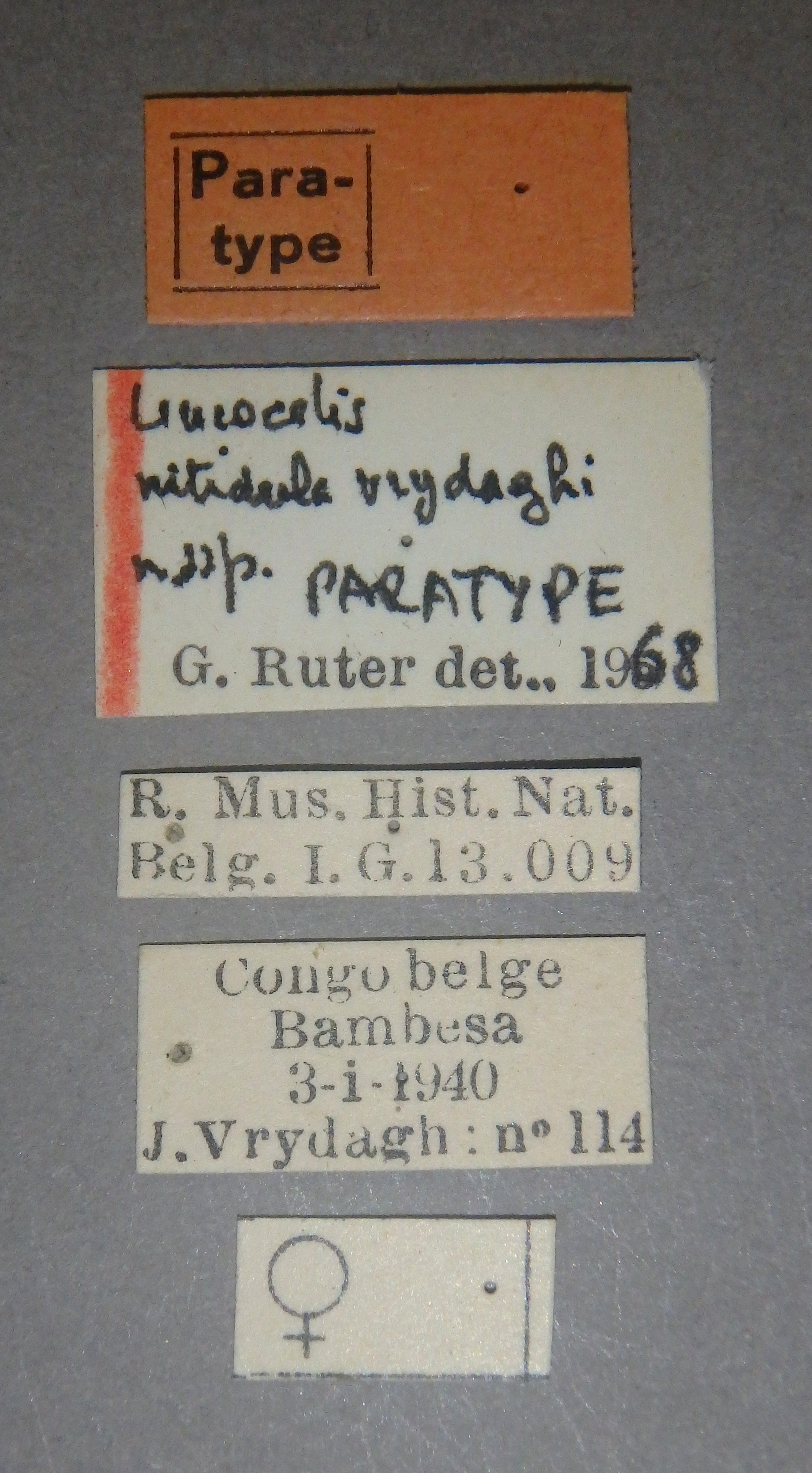 | Leucocelis nitidula vrydaghi Ruter, 1969 | Paratype | F | IRSNB | Royal Belgian Institute of Natural Sciences | RDC | Bas Uélé | Bambesa | 4-I-1940 | Vrydagh J. |
