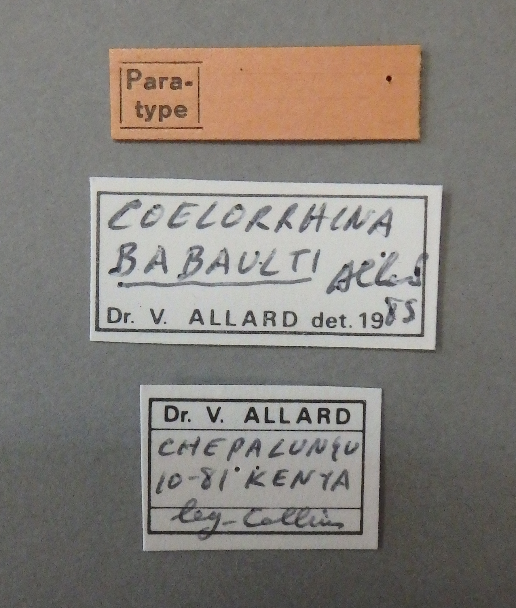 | Coelorrhina babaulti Allard, 1982 | Paratype | F | IRSNB | Royal Belgian Institute of Natural Sciences | Kenya | Chepalungu | X-1981 | COLLINS S.C. | |