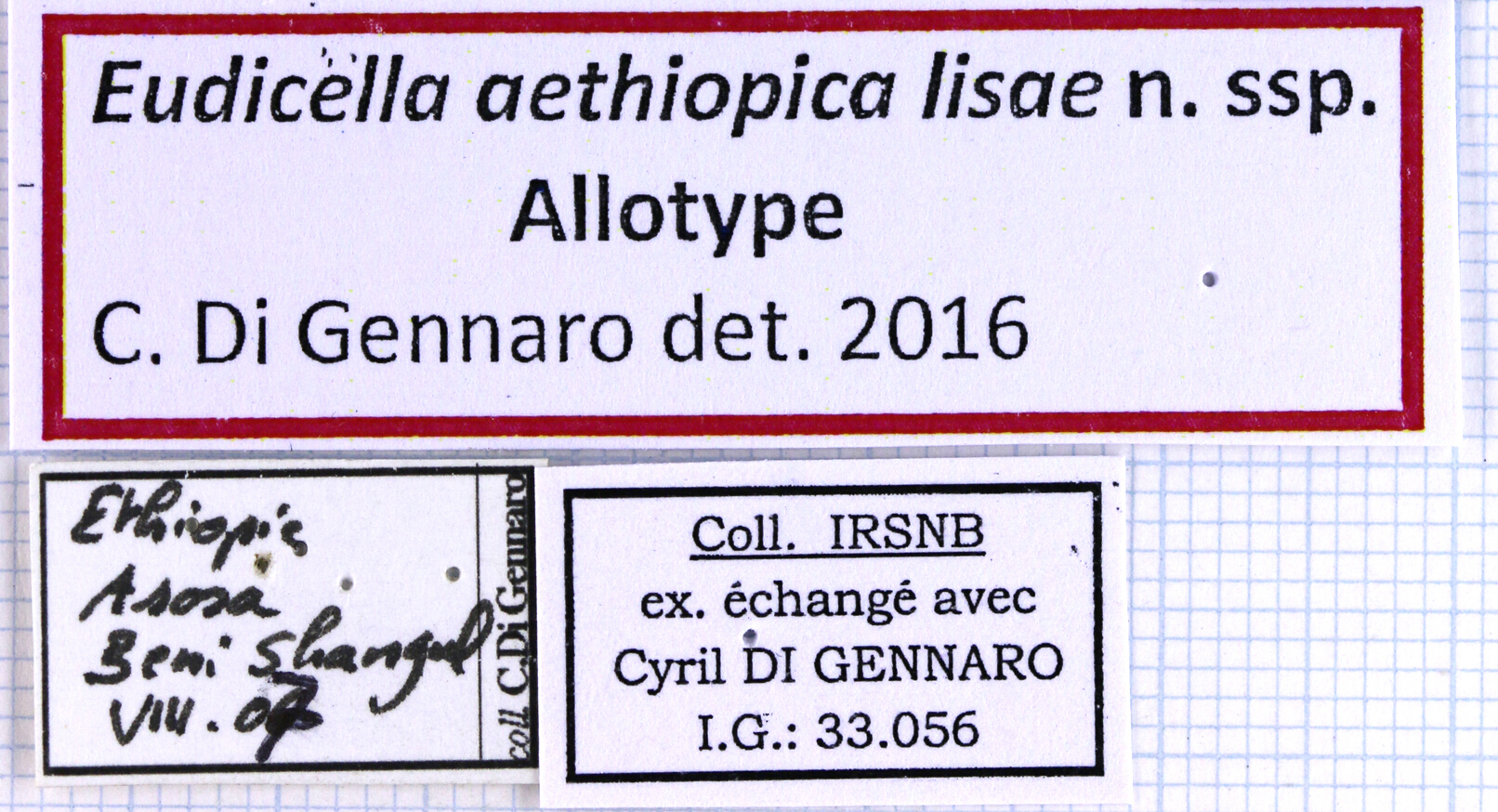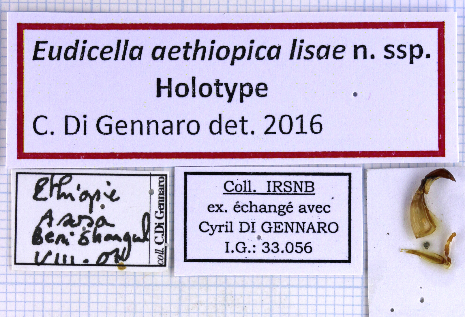 | Eudicella aethiopica lisae Di Gennaro, 2016 | Allotype | F | Di Gennaro Cyril (Arcueil, France) | Institut Royal des Sciences Naturelles de Belgique | Ethiopie | Assossa, Beni Shangul | VIII-2007 |